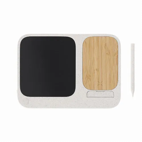 With smartphone holder function, compatible with devices equipped with Qi wireless charging technology and charging status indicator. Features a 6-inch LCD Tablet Chalkboard with Stylus, Erase Button, and Anti-Erase Lock.Materials such as bamboo promote the use of natural raw materials, thus reducing pollutant emissions. It comes from a highly resistant and versatile plant, with rapid growth and regeneration, making it an excellent alternative to the use of traditional wood.Manufactured according to RoHS standards and in compliance with the following safety requirements:Overheating protection system.Over-charge protection system.Blocking system to prevent short circuits.
