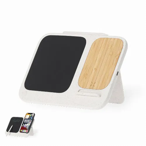 15W Wireless charger with integrated digital board, made of wheat straw and bamboo.