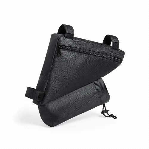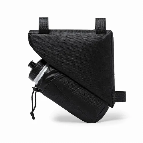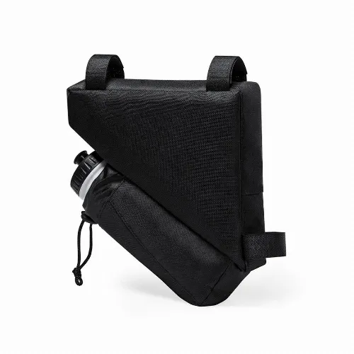 Available in black color. Main compartment with zip and universal adjustment to the bicycle frame by means of 3 velcro strips. Water bottle compartment with adjustable string.