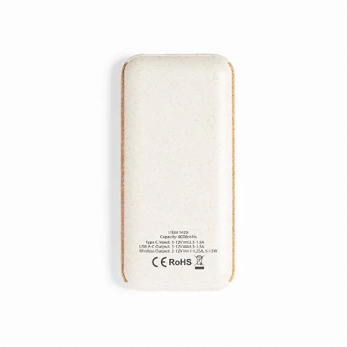 Charging capacity of 8,000 mAh. With integrated wireless charger 15W, with input/output connector Type C + USB output. Presented in an individual box of eco design in kraft cardboard. The capacities shown in all our external auxiliary batteries are real, all of them incorporating non-recycled, grade A batteries, with a service life of at least 500 charging cycles, and complying with CE regulations. In addition, they are manufactured according RoHS standards, and in compliance with the following safety requirements: Power bank overcharge protection system. Complete discharge protection system, which increases the durability of the power bank. Blocking system to prevent short circuits. Constant charging transfer system, in accordance with the capacity of the target device.