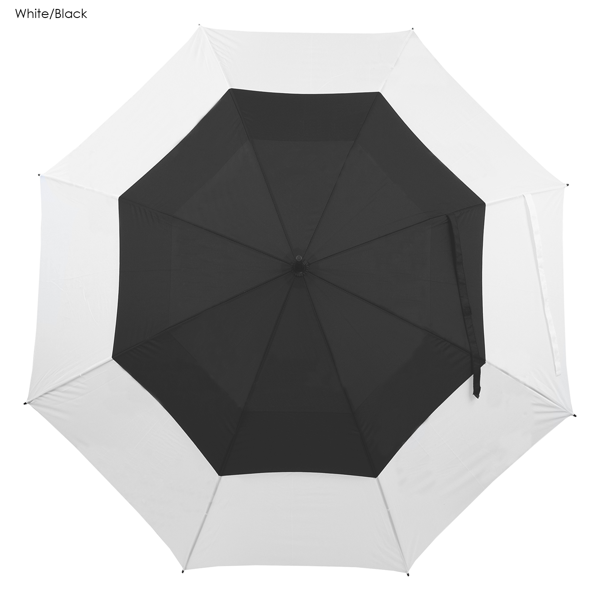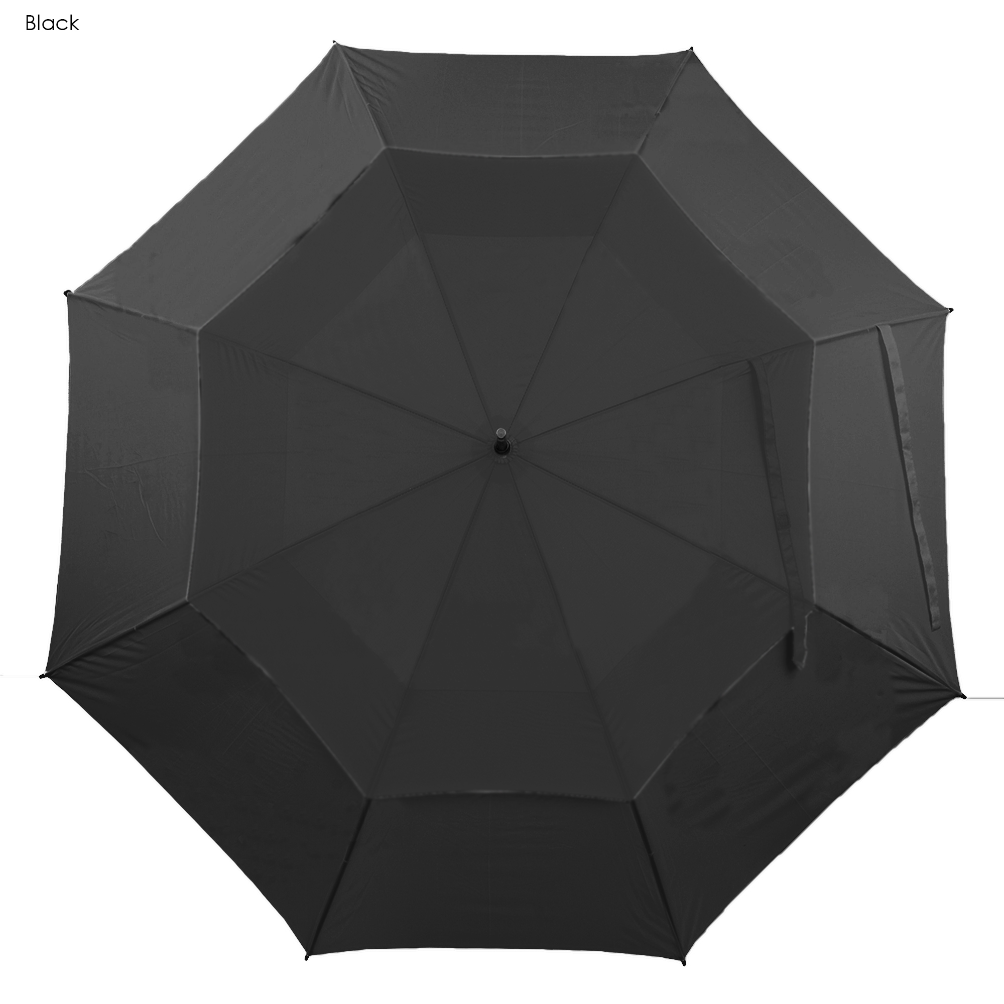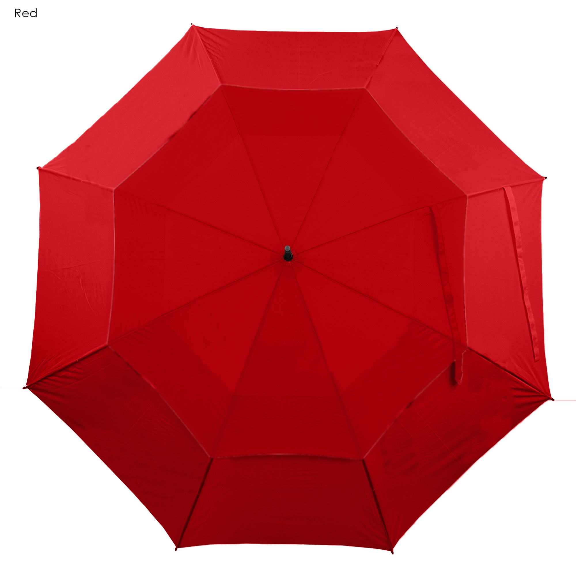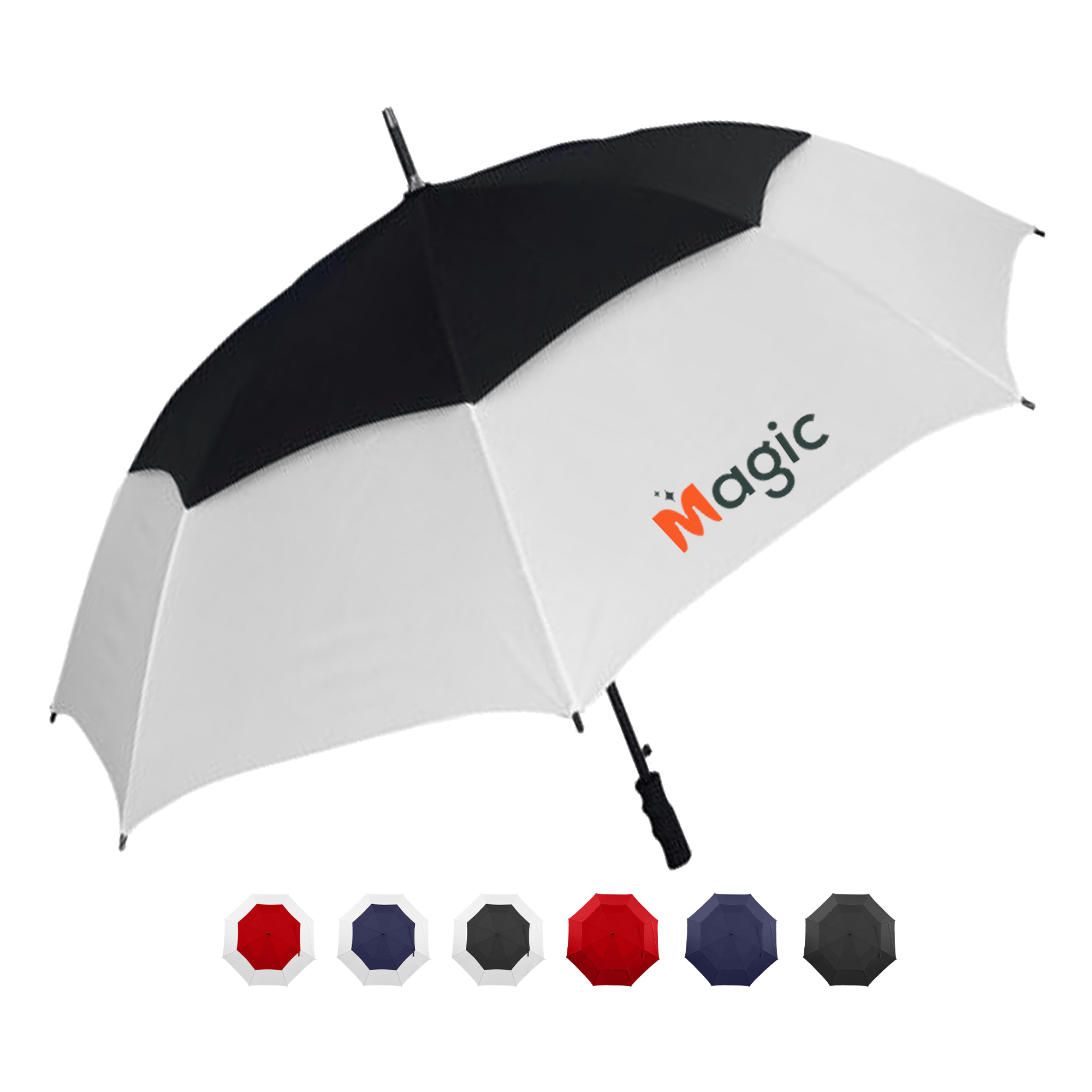 High quality automatic opening wind golf umbrella it has a vented twin-panel showerproof and windproof eight-panel 190T pongee canopy with two velcro ties strong fiber glass shaft with a metal tip black moulded soft-touch rubber handle and 75cm ribs.