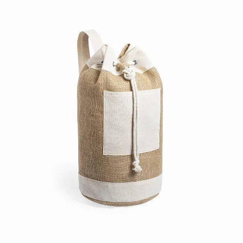 Made of jute, with details in cotton. Adjustable strap and inner pocket. Main compartment with reinforced metal eyelets and front pocket for easy printing.