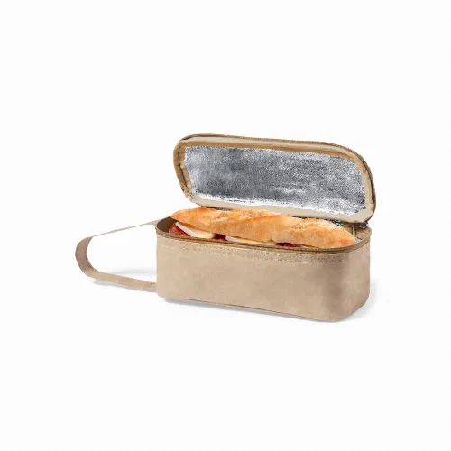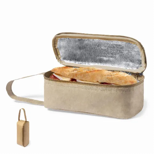 Outside made in resistant recycled laminated paper, and isothermal inside in aluminium. With zip closure and carrying handle.