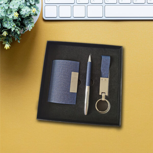 Luxury gift set of the corporate business card holder, pen & keyring in 3 piece cardboard gift box with laser cut foam insert