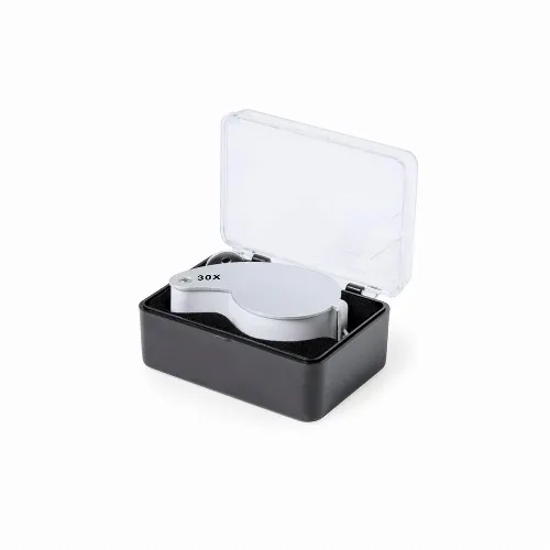 With integrated LED lights and great magnification for a very close view of the smallest details with no distortion. Ideal for inspecting small objects, text, etc. It also has an accessory for hanging and comes inside a case with padded interior for extra protection. Battery powered (button batteries included), with special key to replace them when empty. Presented in a black cardboard box.