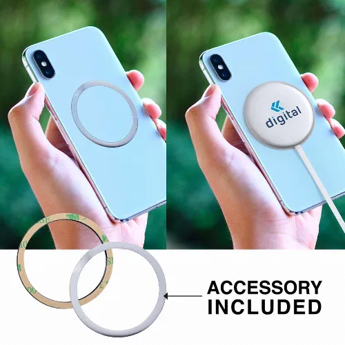 Housing in durable aluminium with silver finish. Charging status indicator and 1m USB cable with aluminium connector. Including metal accessory with 3M adhesive, extra strong fixation and free of residue when detached from the device, allowing the use of the magnetic function of the charger on any mobile device. Compatible with devices equipped with wireless charging technology. Large printing area and presented in an attractive design box. Instruction manual available in English and Spanish.