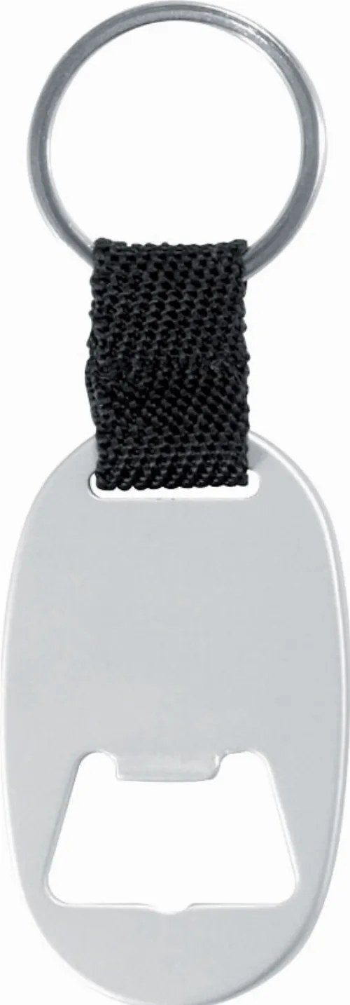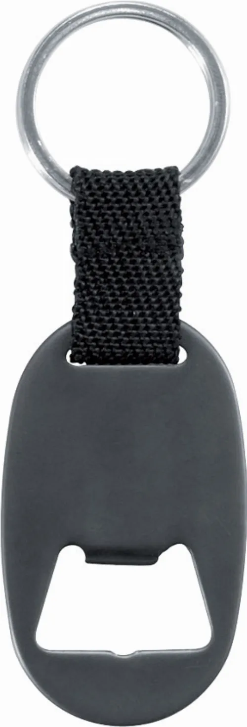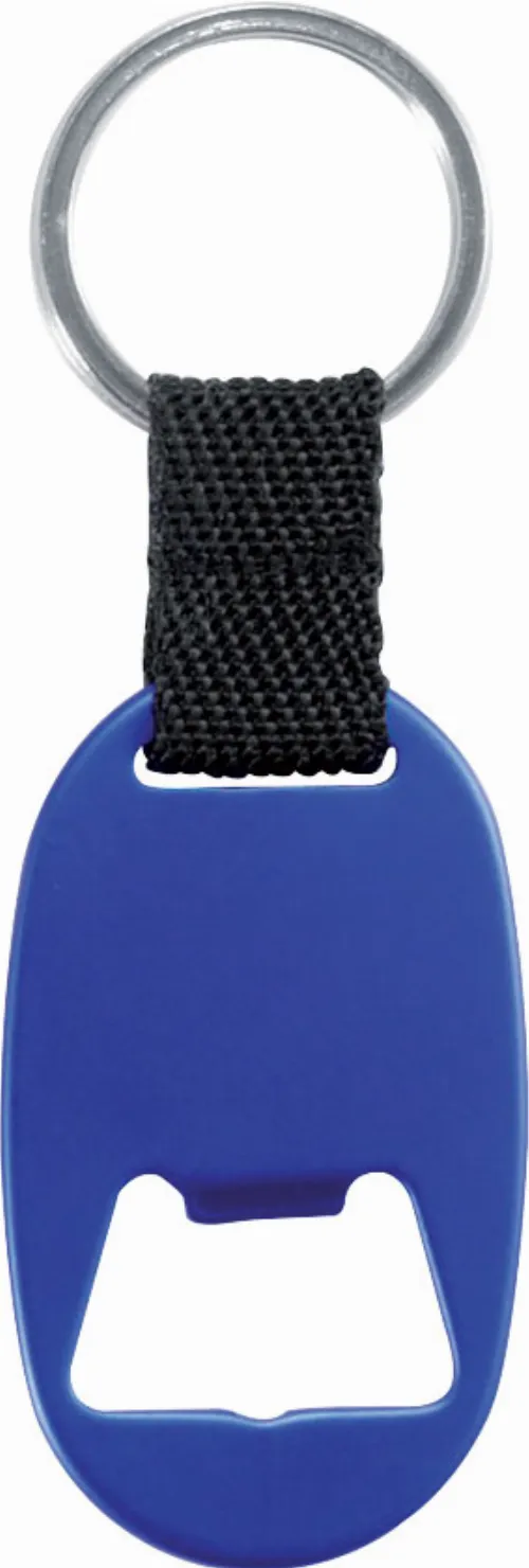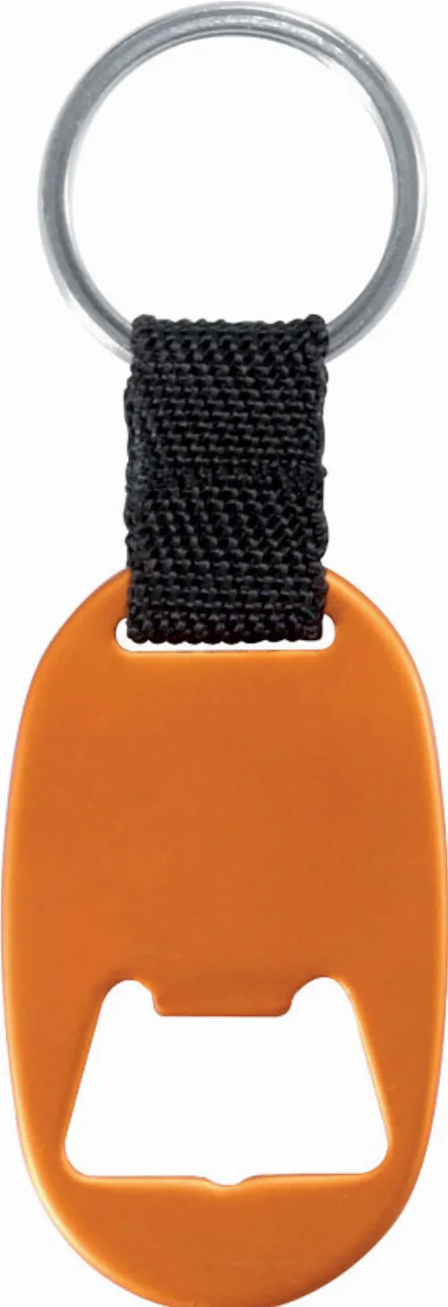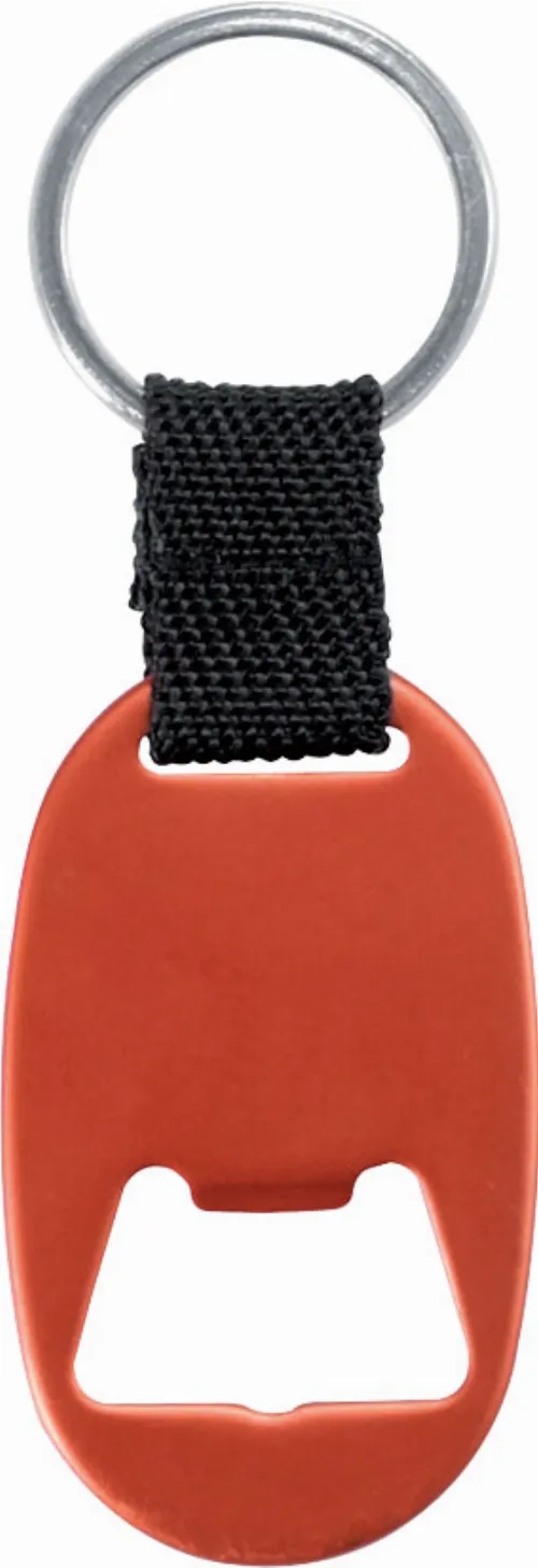 Aluminium bottle opener, bright anodised finish, with nylon strap and keyring. This bottle opener not only empowers you to open your beverages, but keeps your keys company as well. Being an accessory on a key ring, it’s sure to go with your client everywhere. Imprinted with your message, it will keep your company’s name in front of your client at all times