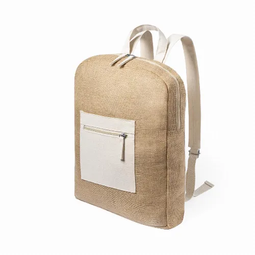 Made of jute, with cotton details. Main compartment with zip and double puller, with front zippered pocket for easy branding and adjustable straps in matching color.