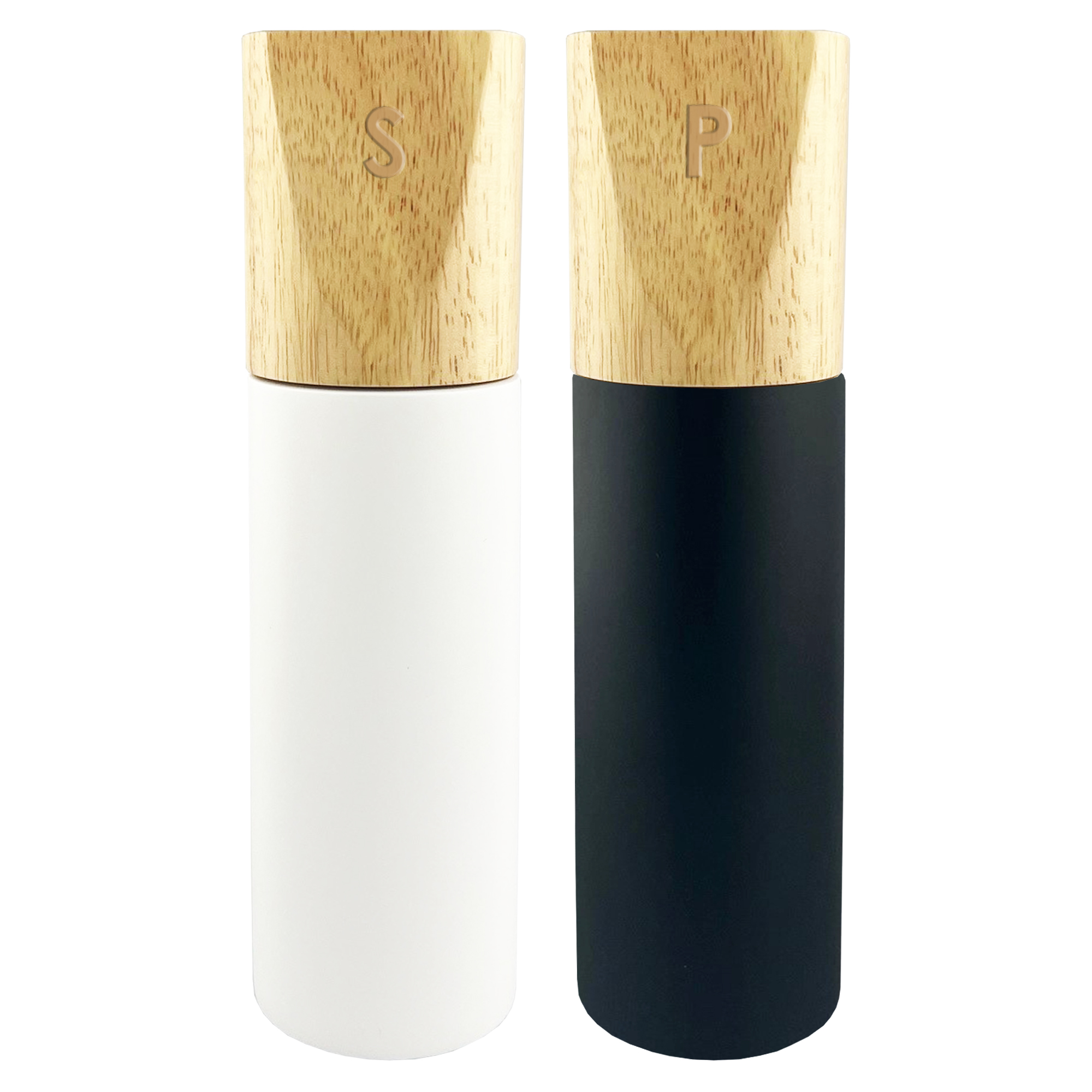 Elegant modern design Maxwell Salt and Pepper Grinder is made of rubberwood which is one of finest furniture making timbers. Features a rubberwood base for holding 2 grinders and black and white paint for salt and pepper. Each grinder is engraved with a letter of P for pepper and S for salt. It is a great corporate gift to add a touch of class to any table.