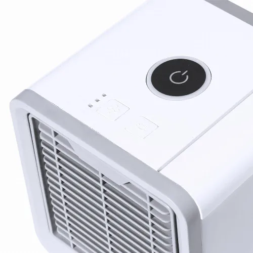Small and lightweight, being easily portable. Fan with a three speed selection (high, medium, low). Including a large capacity water tank -700 ml-, with the possibility of adding ice cubes for a cooler air environment. It is connected to power supply via USB power cable -included- and comes individually packaged in a kraft design box. Instruction manual available in English and Spanish.