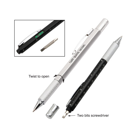 Multifunctional pens are perfect for those who love tools! The product contains a pen with measuring device and 2 screwdrivers (flat head and Phillips), Measuring device with metric and imperial scales. Made of materials such as aluminum and titanium alloy. Highlight your design with pad print, UV print or laser engraving. The pen extends and retracts with a twisting action and features black ink. Available in black, silver, yellow, blue.