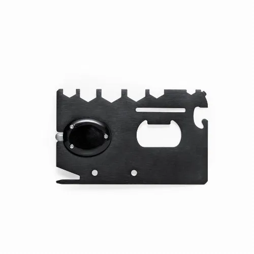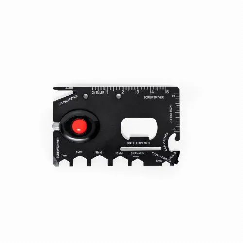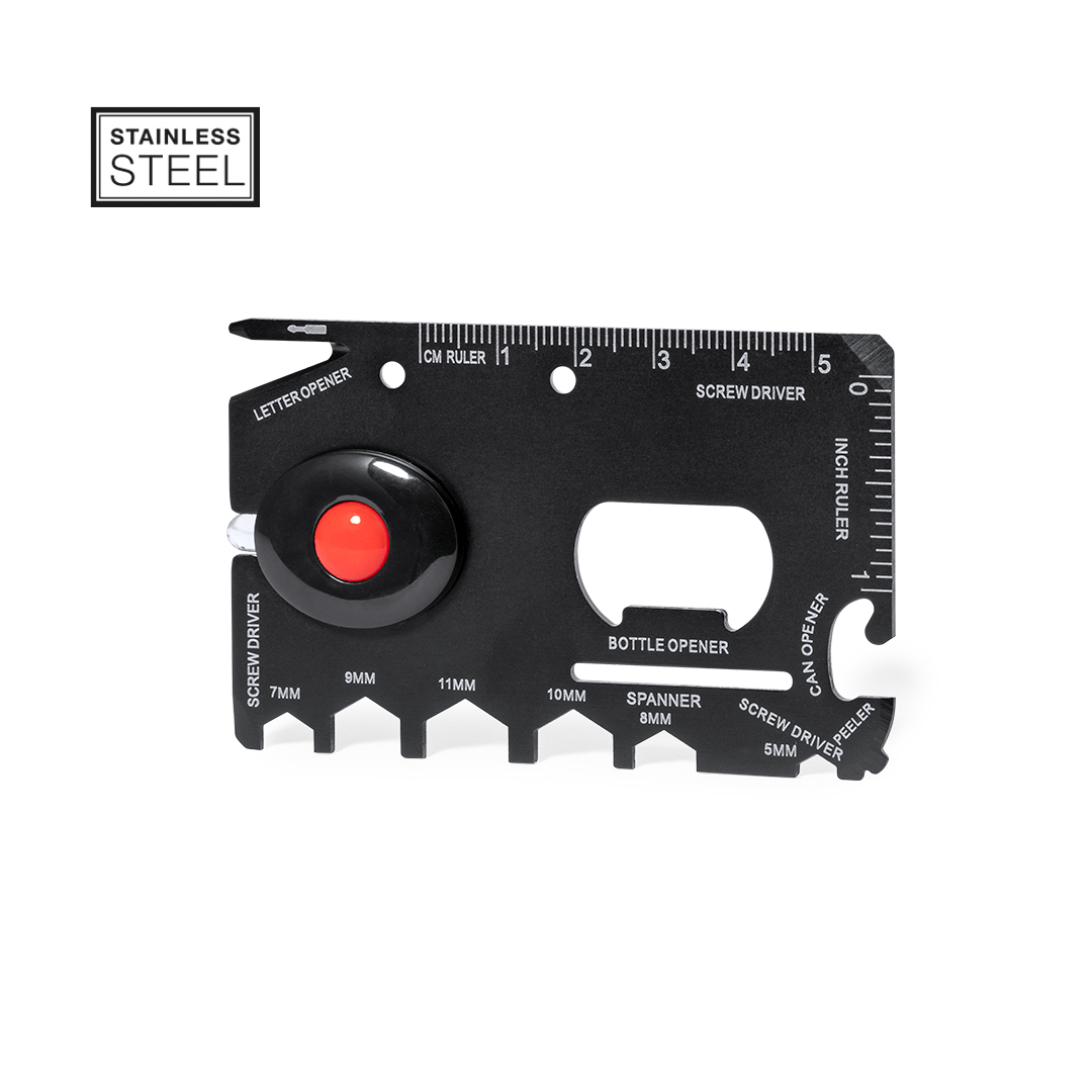 Flat card-shaped design with 16 functions: flat screwdrivers, letter opener, ruler in cm and inches, bottle opener, can opener, peeler, spanner for hex nuts in various sizes and torch (button battery included). Presented in an individual bag made of recycled paper.