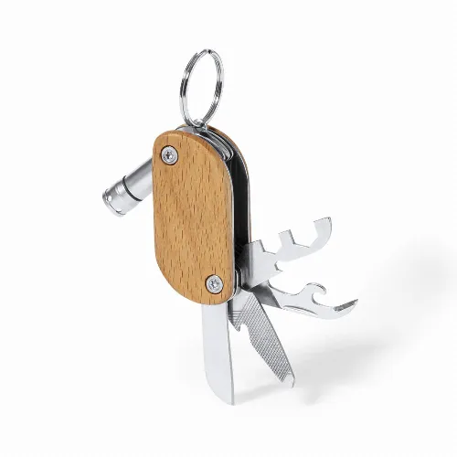 Handy multi-tool key ring made in resistant stainless steel and wood.