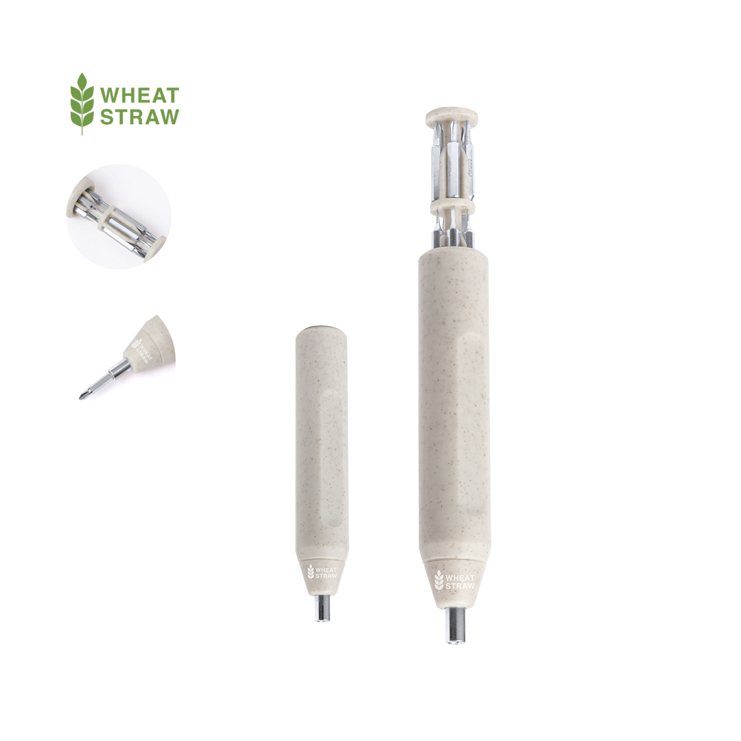 Including a compartment inside the handle for storing multiple magnetic bits (flat and philips). With a wheat straw logo included and presented in a kraft design box.Wheat straw promotes the use of natural raw materials, thus reducing pollutant emissions.