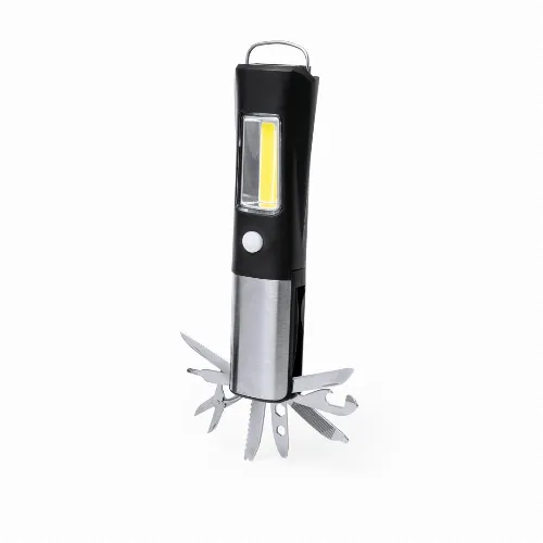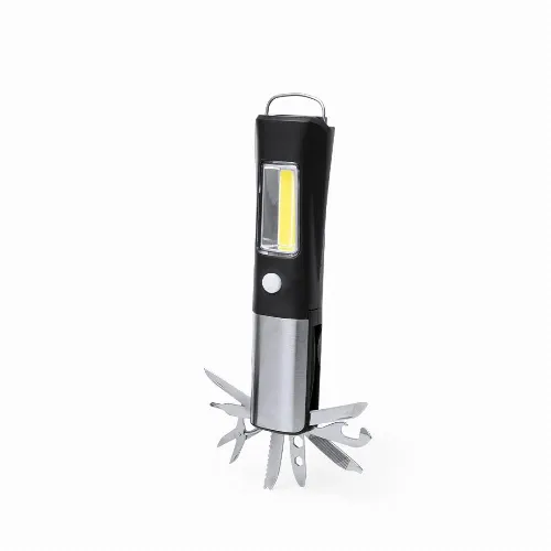 Includes 19 COB side torch with two lighting positions ( steady and flashing ). It has 13 functions, including flat knife, serrated knife, philips screwdriver, scissors, flat screwdrivers, hexagon spanner in various sizes, can opener, bottle opener and a file. With magnet and handle. Powered by 3 AAA batteries, not included. Presented in a kraft design box.