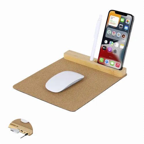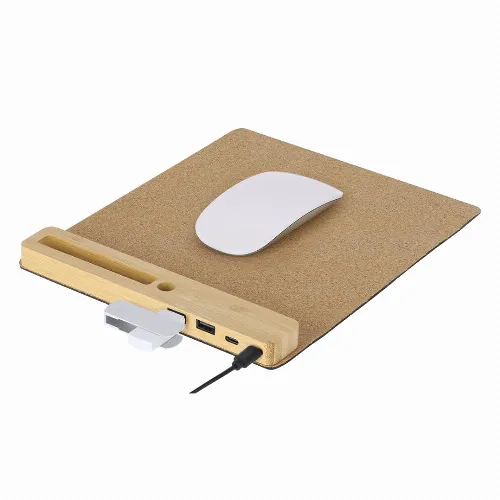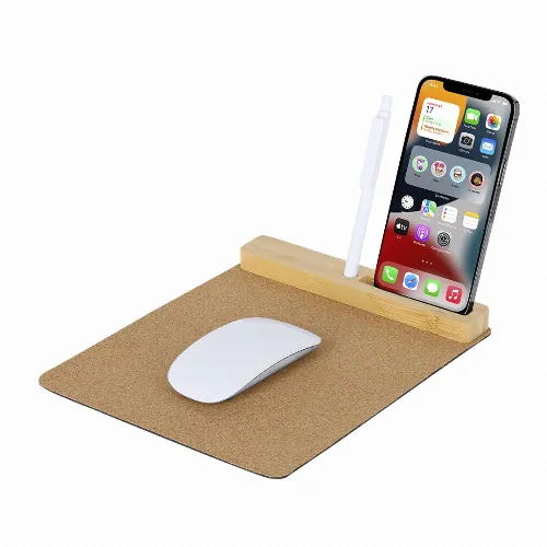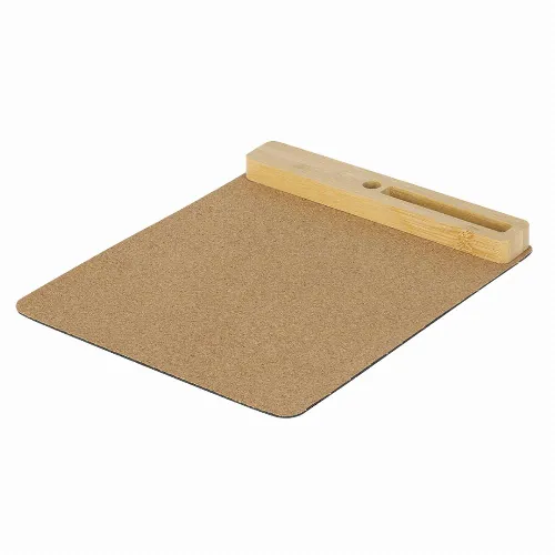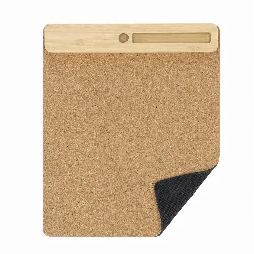 Multifunctional mouse pad made of a combination of soft cork and bamboo.