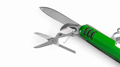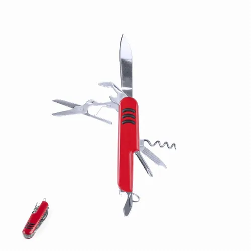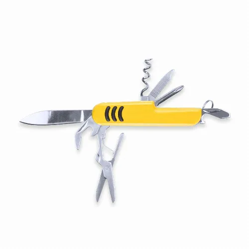 Multi purpose knife with stainless steel accessories of 9 functions and handle with non-slip accessory in bright tones.