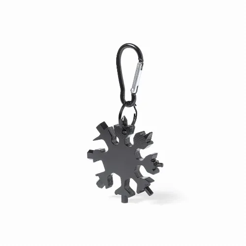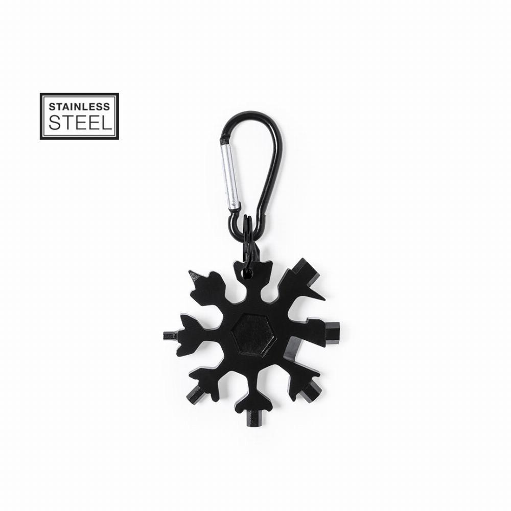 Genuine and handy multi-tool made in resistant stainless steel in black finish, with matching ring and carrying carabiner.