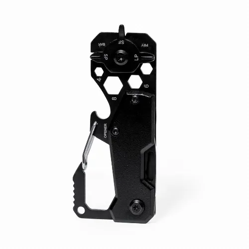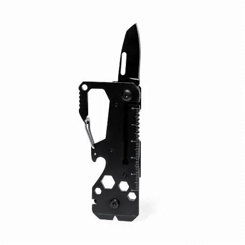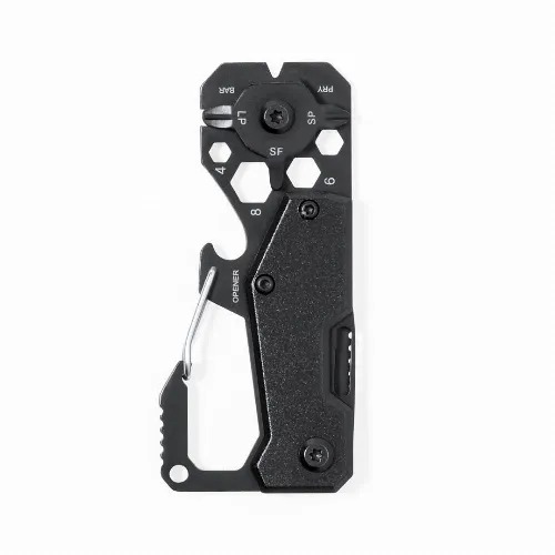 With 13 different functions: spanner for hex nuts in various sizes, carabiner, can opener, ruler, scraper, knife, flat and phillips screwdrivers. Presented in a kraft design box.