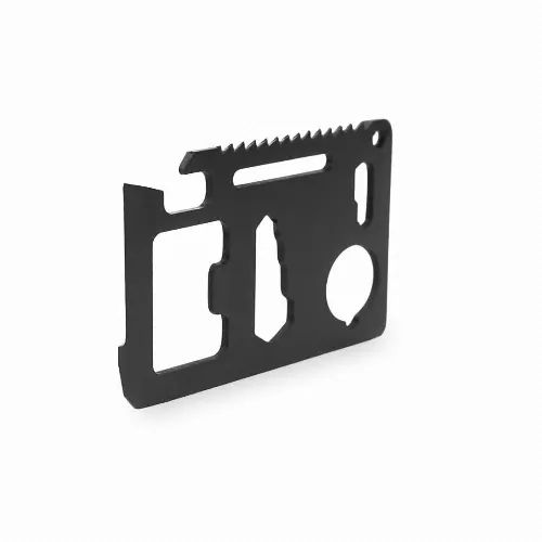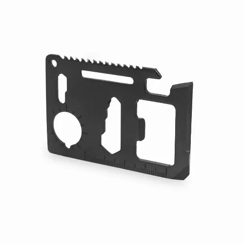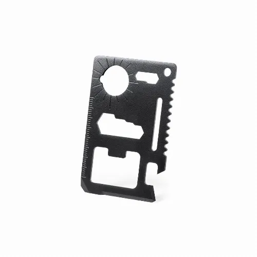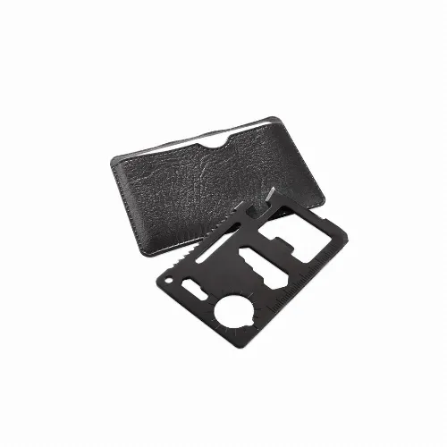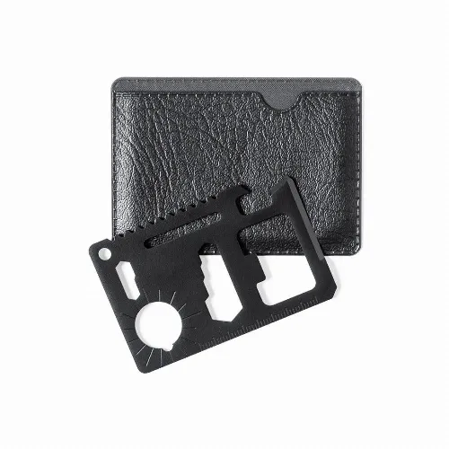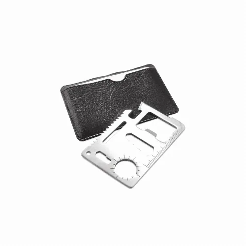With can opener, knife, screwdriver, ruler, bottle opener, bottle opener, spanners, butterfly keys, saw and direction indicator. Presented in resistant leather case.
