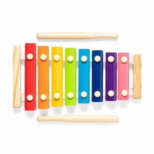 Xylophone with base and drumsticks in natural pine wood.