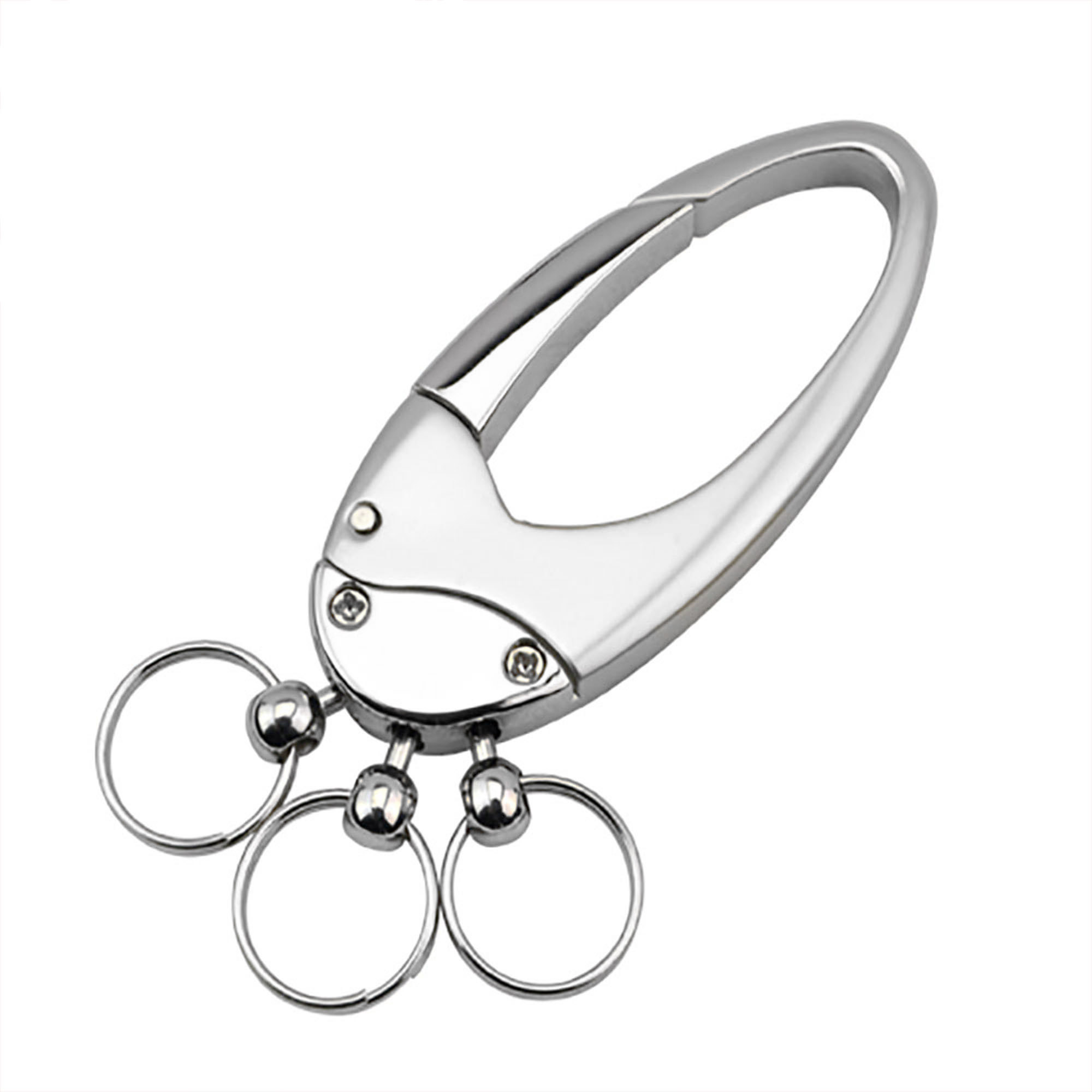 Multi hoop key ring made of zinc alloy metal 3 rings attached to separate different group of keys side push open and close bar to hook key ring onto your belt. can be laser engraved and printed print may fade over time.