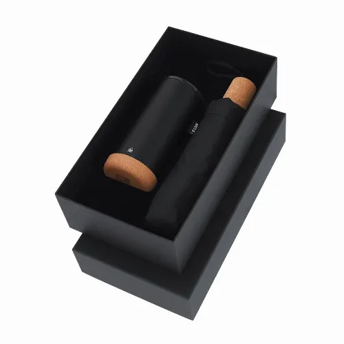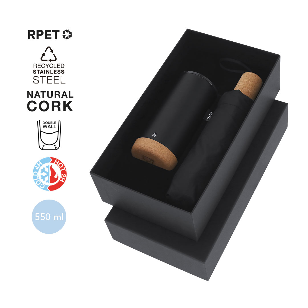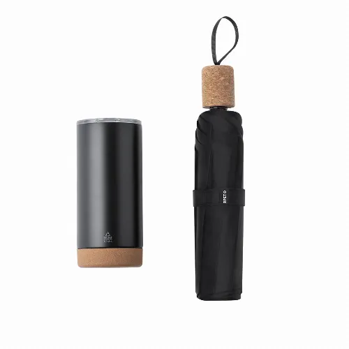 Including: Recycled Stainless Steel thermos tumbler with double wall and 550 ml capacity, in elegant matte black finish. Cork base, with push-on lid and dispenser. It is ideal for your desk, table, or any surface where you can enjoy your favorite drink. Foldable black umbrella with 98cm diameter. In 190T RPET pongee material and with cork handle. Manual opening, with windproof mechanism and fibre glass ribs. With distinctive RPET label. Set presented in an individual matte-finish case, with inner die-cutting for each of the elements of the set. The RPET material is made from recycled plastic, promoting the reuse of plastic waste and helping the sustainability of the planet.