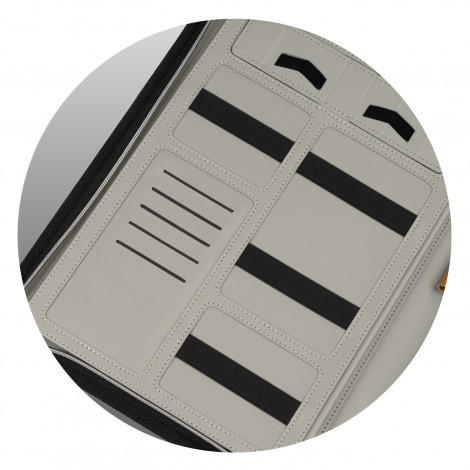 Durable PU leather portfolio with a tan strip and a zippered closure. It includes an A4 lined pad, a phone stand, a double strap holder, two single strap holders, a pen holder, and six business card holders.