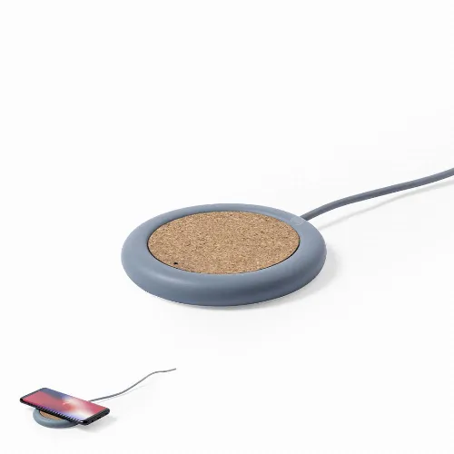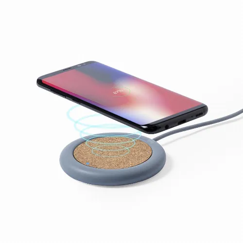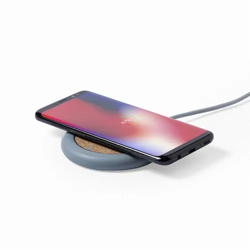 5W wireless charger of nature line and circular design, in combination of natural cork and limestone cement, a conglomerate formed by the mixture of natural materials, mainly ground limestone and water, obtaining a material of great consistency and durability.