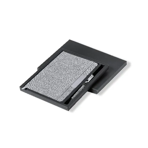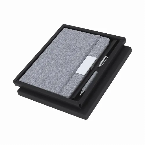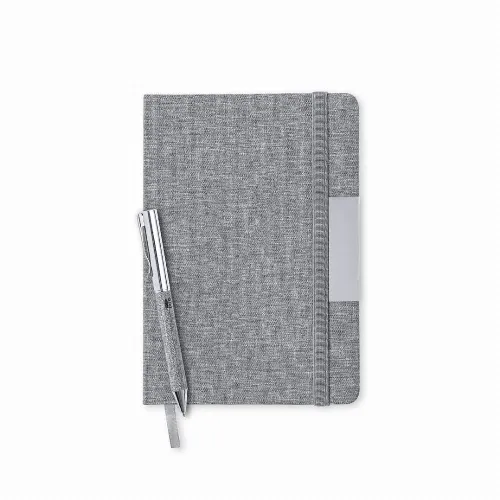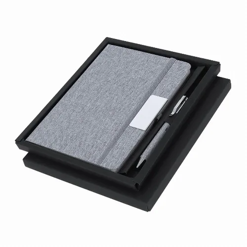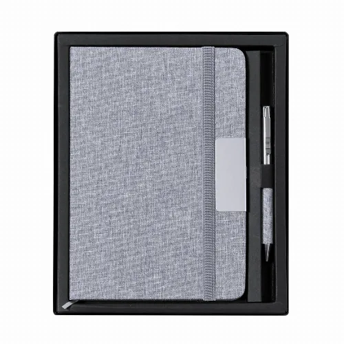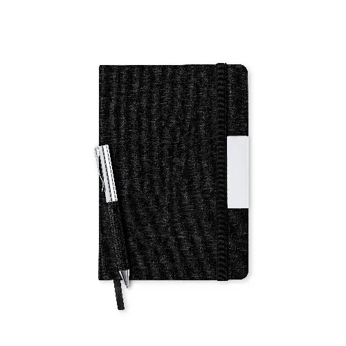 Including: Hard cover notepad, with metal insert on front cover, fabric bookmark and matching elastic binding. 100 sheets inside with striped layout and RPET distinctive at the back cover.Chrome-plated metal ball pen with RPET polyester-coated barrel. Elegant metal clip and matching accessories, twist mechanism and blue ink. With RPET distinctive on barrel.Set presented in an elegant black design case, with independent compartment for notepad and ball pen.