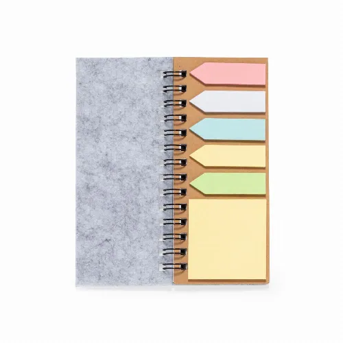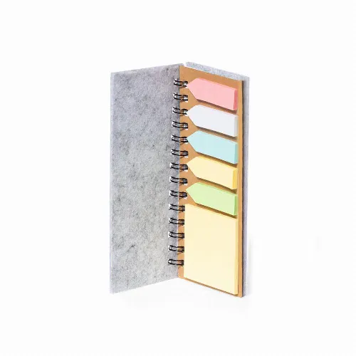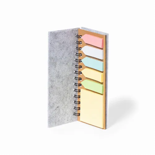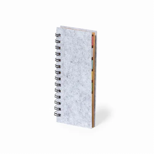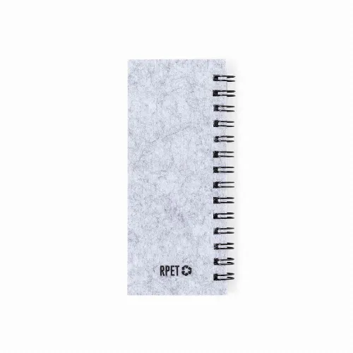 With RPET logo on cover. Including:Ring binder of 30 white sheets with single-stripe layout and recycled stamp on both sides.25 medium sticky notes.125 mini sticky notes in various colours.The recycled RPET felt is the result of the combination of the recycling process of plastic materials together with the millenary technique of felt making, resulting in an eco-trend material that, besides being of recycled origin, also becomes recyclable.Presented in an individual recycled bag.