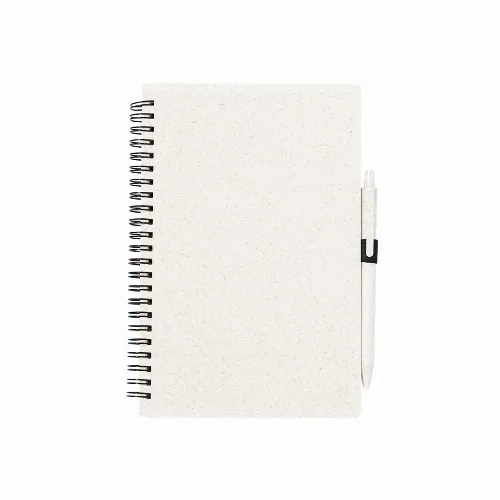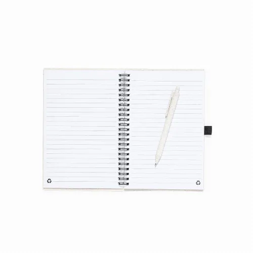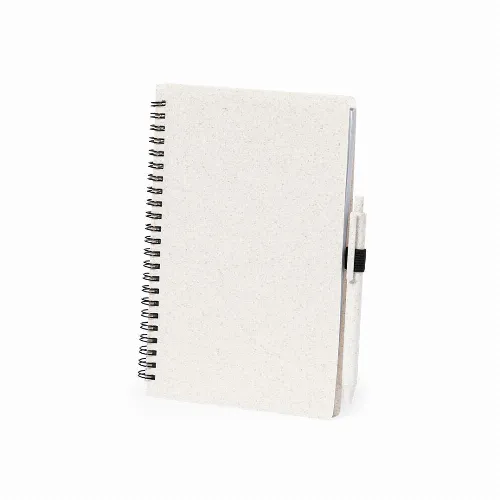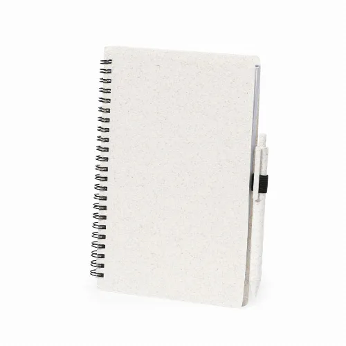 Ring notebook with wheat straw covers and pen holder. 80 sheets with eco design and single-stripe layout. Push-button mechanism ball pen with wheat straw barrel and blue ink. With Wheat Straw logo. Presented in an individual recycled bag.Made with vegetal elements to encourage the use of natural raw materials and reduce pollutant emissions.