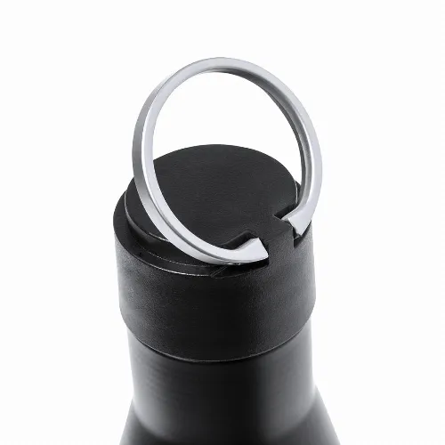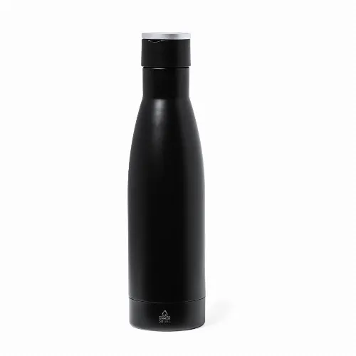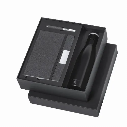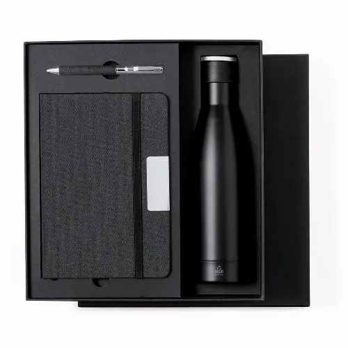 Including: 500 ml capacity,double-layer flask made in Recycled Stainless Steel with matte black finish, and rigid handle in matte silver metal. With stainless steel logo.RPET notepad in an elegant black colour, with a special metal late for laser engraving. Including elastic closure and fabric bookmark. Interior with 80 sheets of single-striped layout. With RPET logo.RPET ball pen with matt black finish, twist mechanism and blue ink. With clip and polished metal tip. Set presented in an individual matte-finish case, with inner die cut for each of the elements of the set.The RPET material is made from recycled plastic, promoting the reuse of plastic waste and helping the sustainability of the planet.
