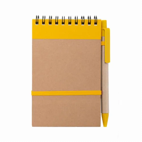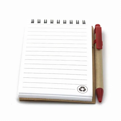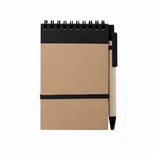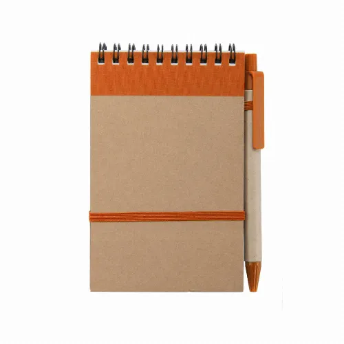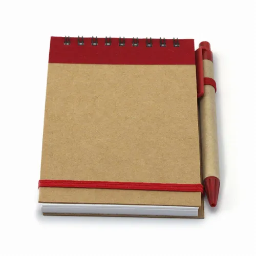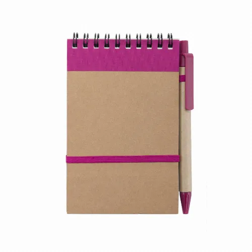 With soft covers, elastic band on the front cover and matching color, recycled cardboard ball pen. Available in striking colours.