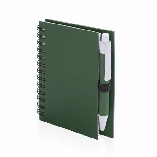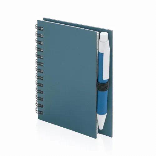 Ring notebook with soft-touch covers in resistant recycled cardboard and ball pen in matching color recycled cardboard.