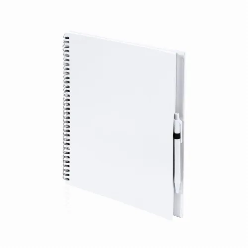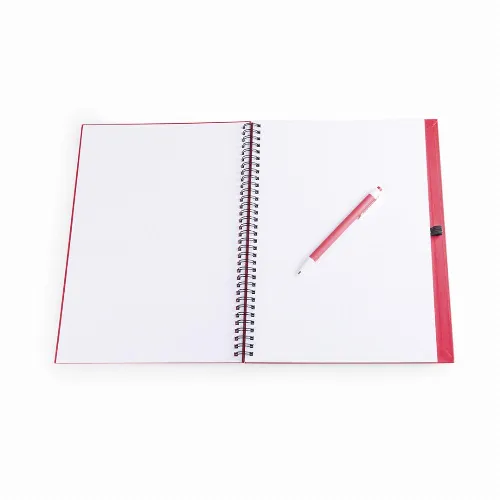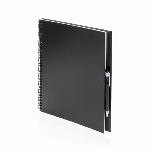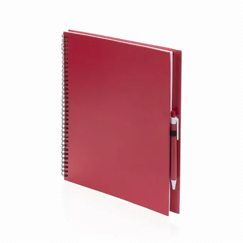Bold colors, 80 blank sheets and ball pen holder on back cover.