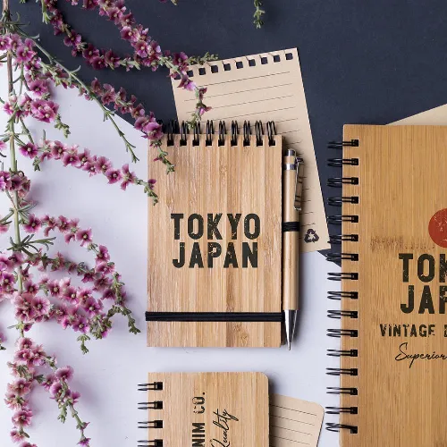 Nature line, ring notepad with hard, bamboo wood covers and self material ball pen.