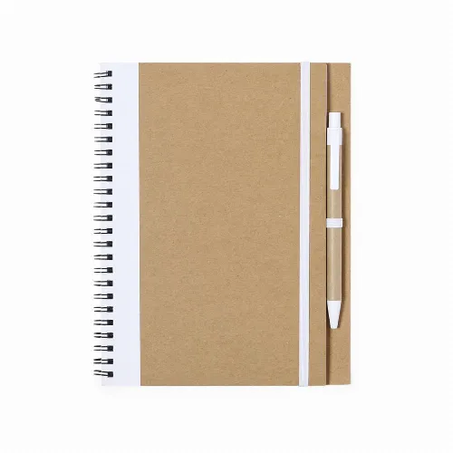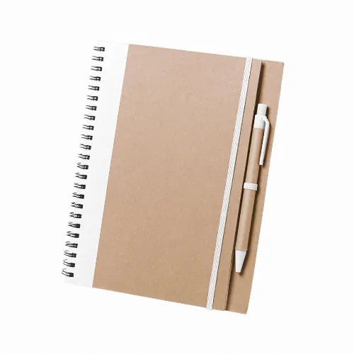 With two-tone hard covers in natural tones and available in a wide range of colours. With elastic closing band, matching color ball pen holder and recycled cardboard ball pen.