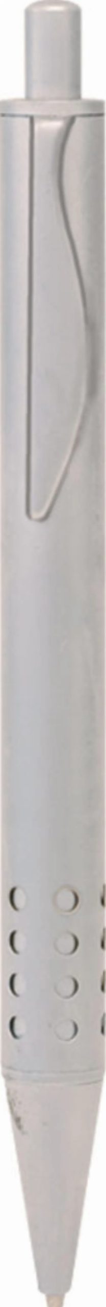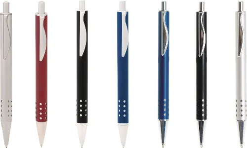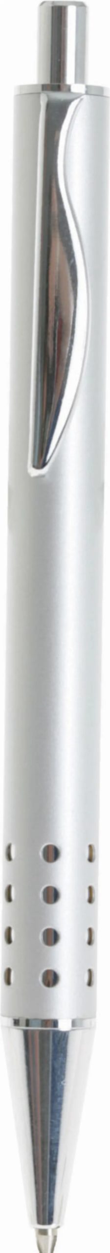Modern style push button metal pen with curved clip and shiny or matt silver trim. Parker style black refill.