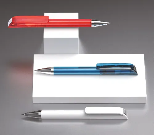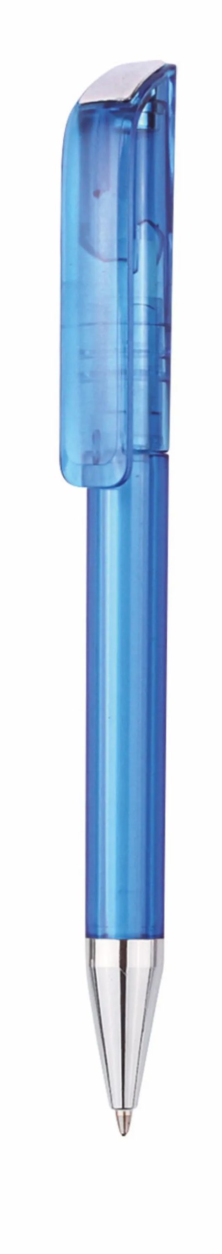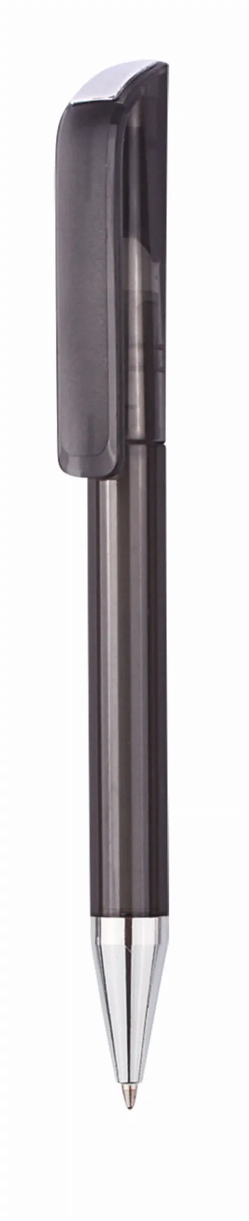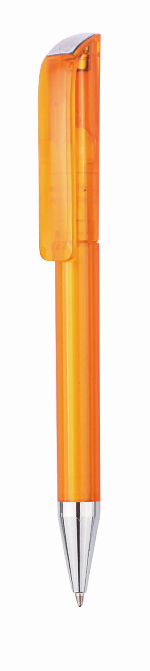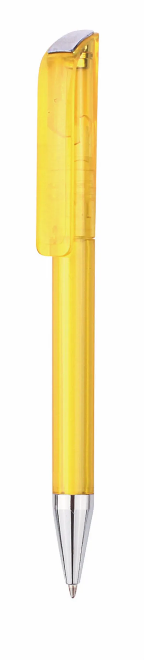 Twist action plastic ballpoint pen of European design. The pen has a solid coloured barrel and large clip, with a chromed tip and trim.