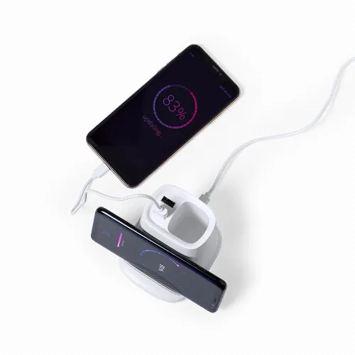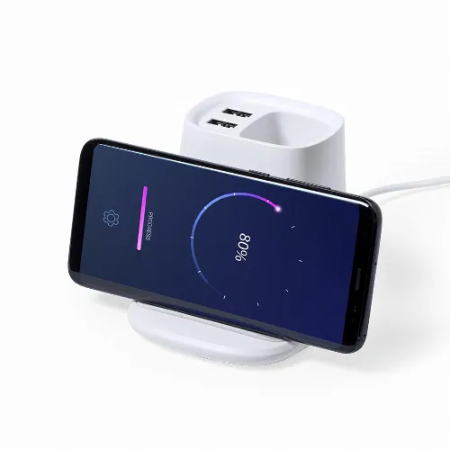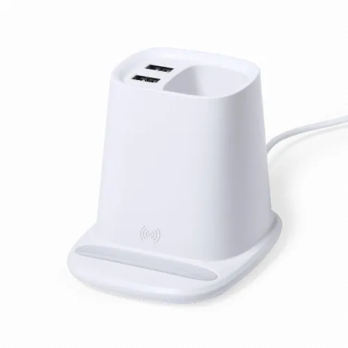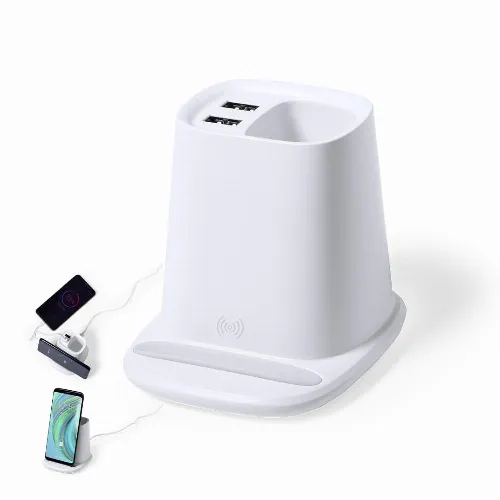 With functions ball pen holder, smartphone holder, 5W wireless charger, including 2 USB 2000 mA outputs. USB port suitable for data transfer. Compatible with smartphones with wireless charging technology. Includes 1 metre long type C cable and comes in an attractive design box. Instruction manual available in Spanish and English.