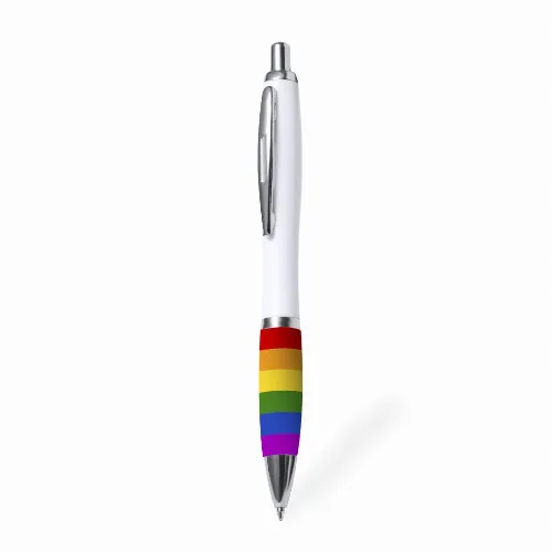 Rainbow ball pen, with multicoloured grip and white finish barrel.