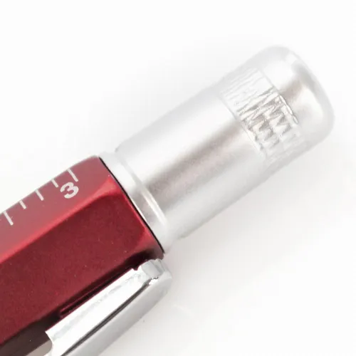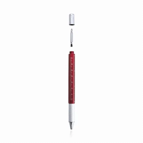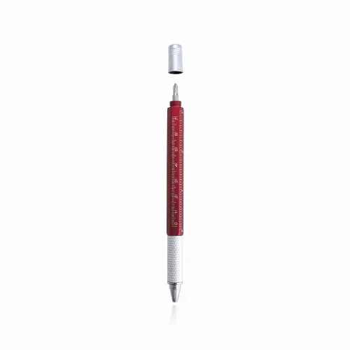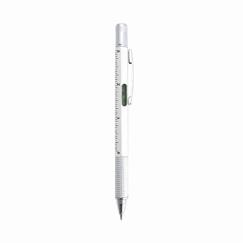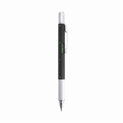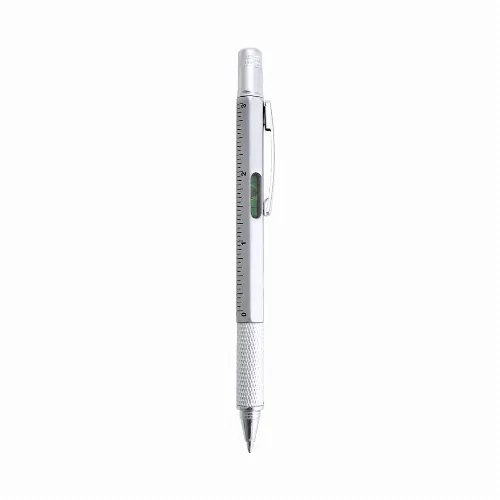 With built-in level in body, ruler with metric system in centimeters/inches and double-head screwdriver -flat and star-shaped. With metallic clip and blue ink.
