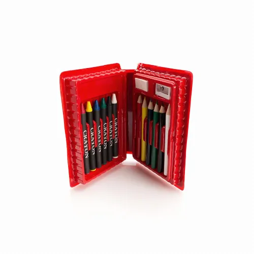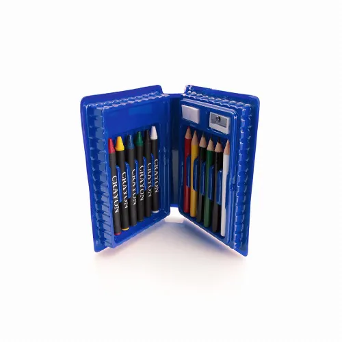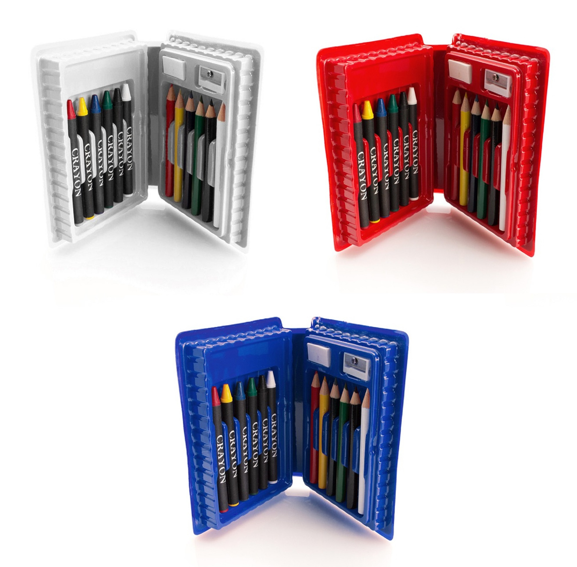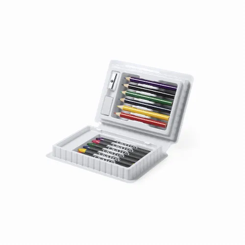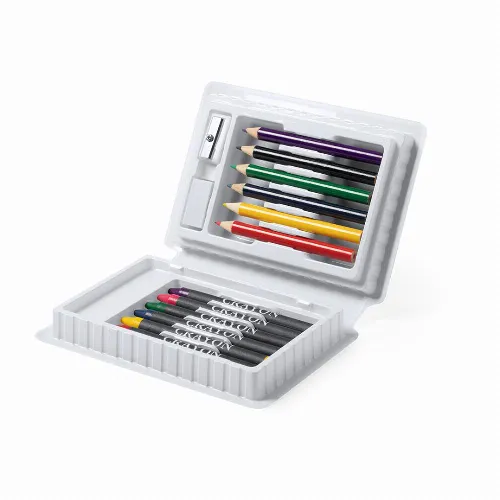 Inside with security compartments. Contains rubber, pencil sharpener, crayons and wooden pencils of cylindrical body in varied colors.