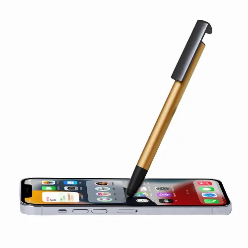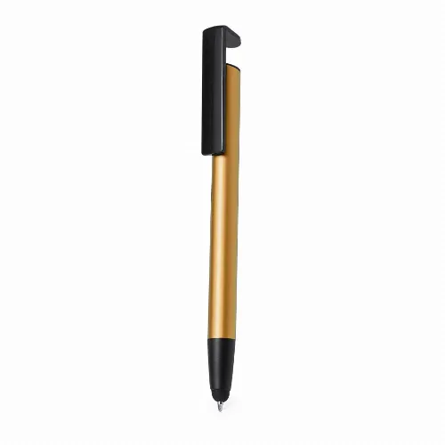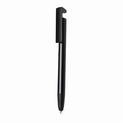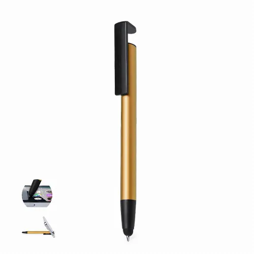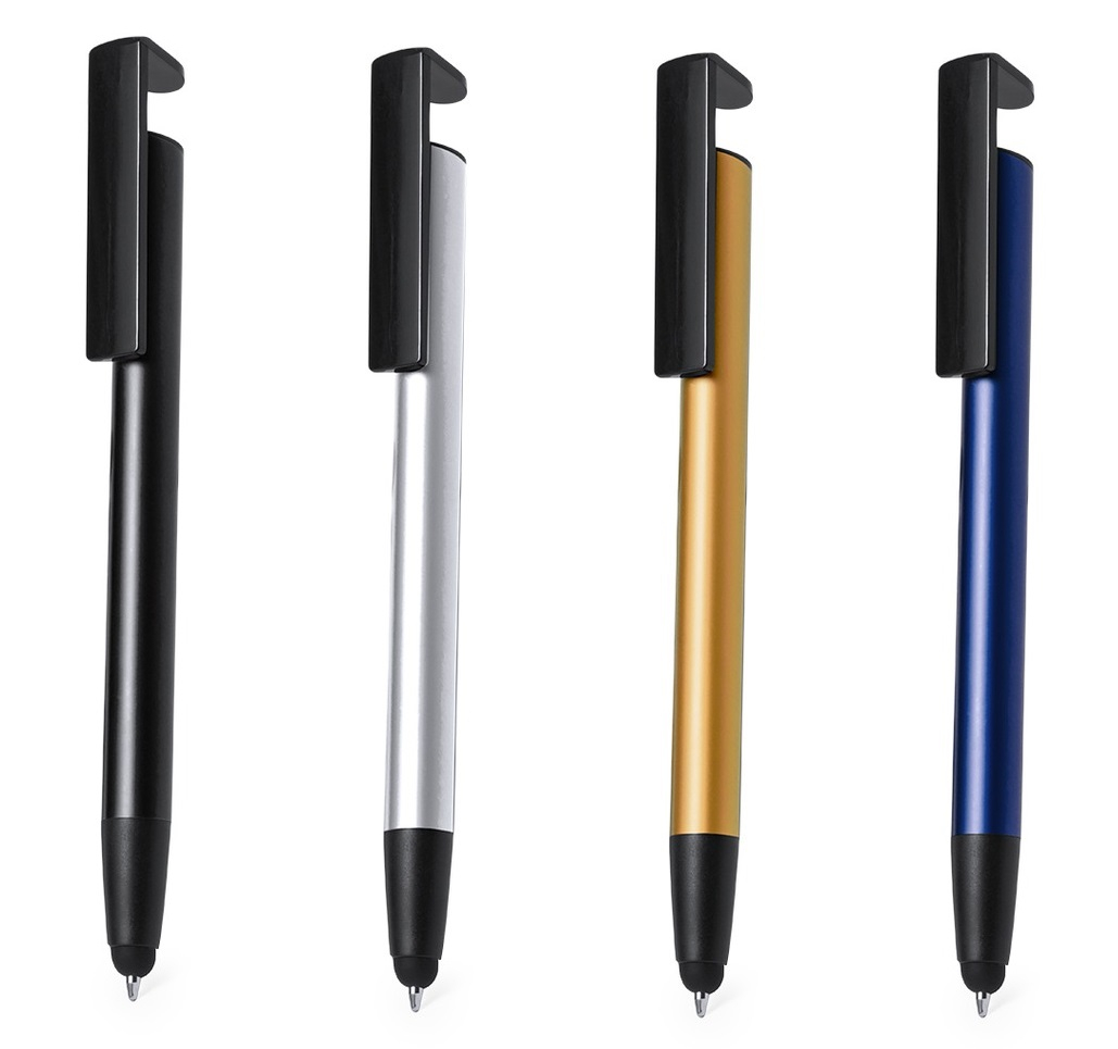With integrated mobile holder in clip and smooth barrel in a range of metallic colours. In blue ink and individually packaged in a recycled bag.