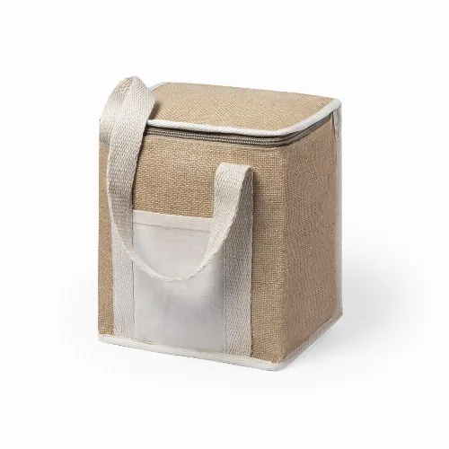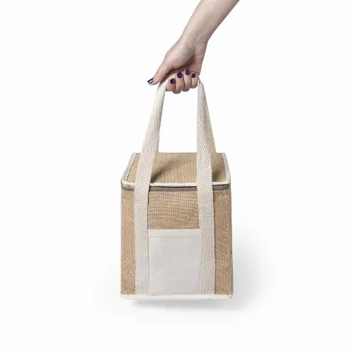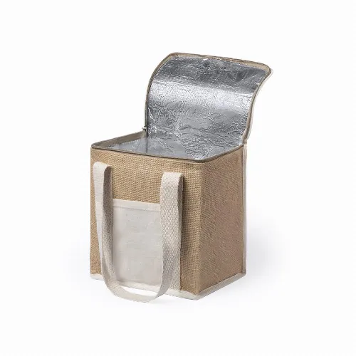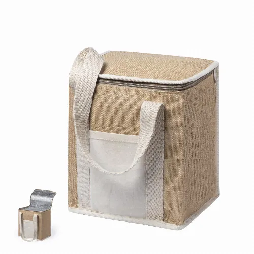Made of moisture resistant laminated jute, with isothermal interior finished in aluminium and matching zip. Cotton handles and outer pocket for printing made in cotton.