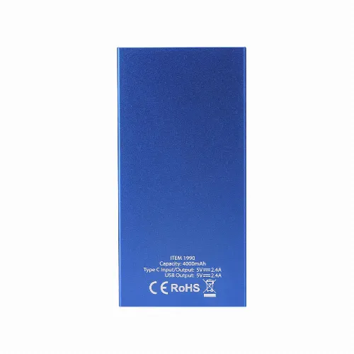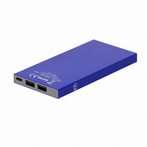 Made of recycled aluminium, a material with almost infinite recycling possibilities, keeping its original properties and consuming less energy in this process. With 2 USB outputs and dual input and output connection Type-C. LED charging status indicators and Type-C charging cable included. Available in a wide range of colours and presented in an individual kraft box, with instruction manual in English and Spanish.USB C Input/Output: 5V DC 2.4VUSB Outputs: 5V DC 2.4AThe capacities shown in all our external auxiliary batteries are real, all of them incorporating non-recycled, grade A batteries, with a service life of at least 500 charging cycles, and complying with CE regulations. In addition, they are manufactured according RoHS standards, and in compliance with the following safety requirements: Power bank overcharge protection system. Complete discharge protection system, which increases the durability of the power bank. Blocking system to prevent short circuits. Constant charging transfer system, in accordance with the capacity of the target device.
