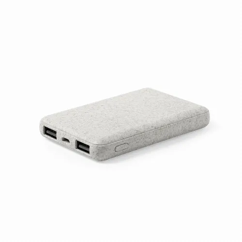 5,000 mAh, ultra compact, external auxiliary battery in nature line, with shell in wheat straw, to encourage the use of natural raw materials and reducing contaminant emissions.