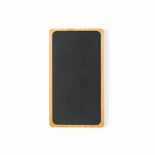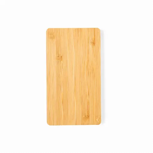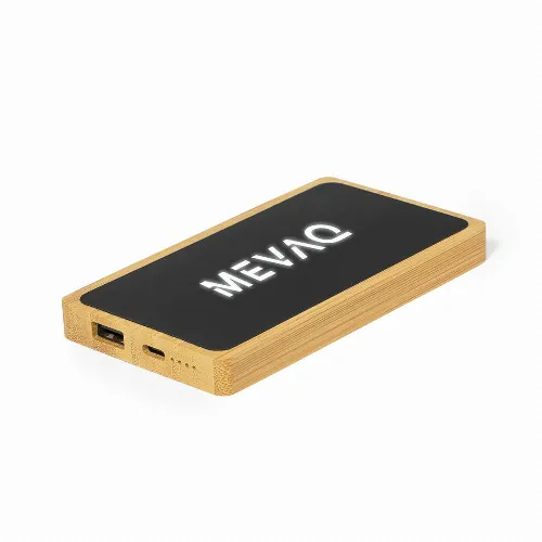5,000 mAh external auxiliary battery made of bamboo with an elegant black surface, inner LED light and an outer coating specially designed for laser engraving, lighting up the logo.