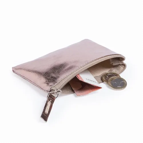 Available In golden, silver and golden pink colors. Main compartment with zipper closure and puller in matching color.